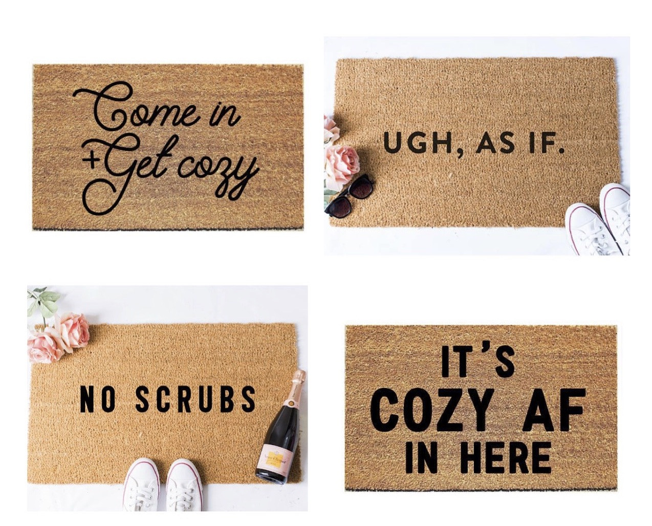Who doesn't love a great doormat? Exactly. Everyone does, and the best ones are the one that make you laugh, smile and think. My current doormat reads, "Beware of the chickens". Since we have a little chicken farm with free range birds. If I didn't have our new doormat I would have one of these. And these doormats from Fox and Clover are making me wish I had lots of front doors.
